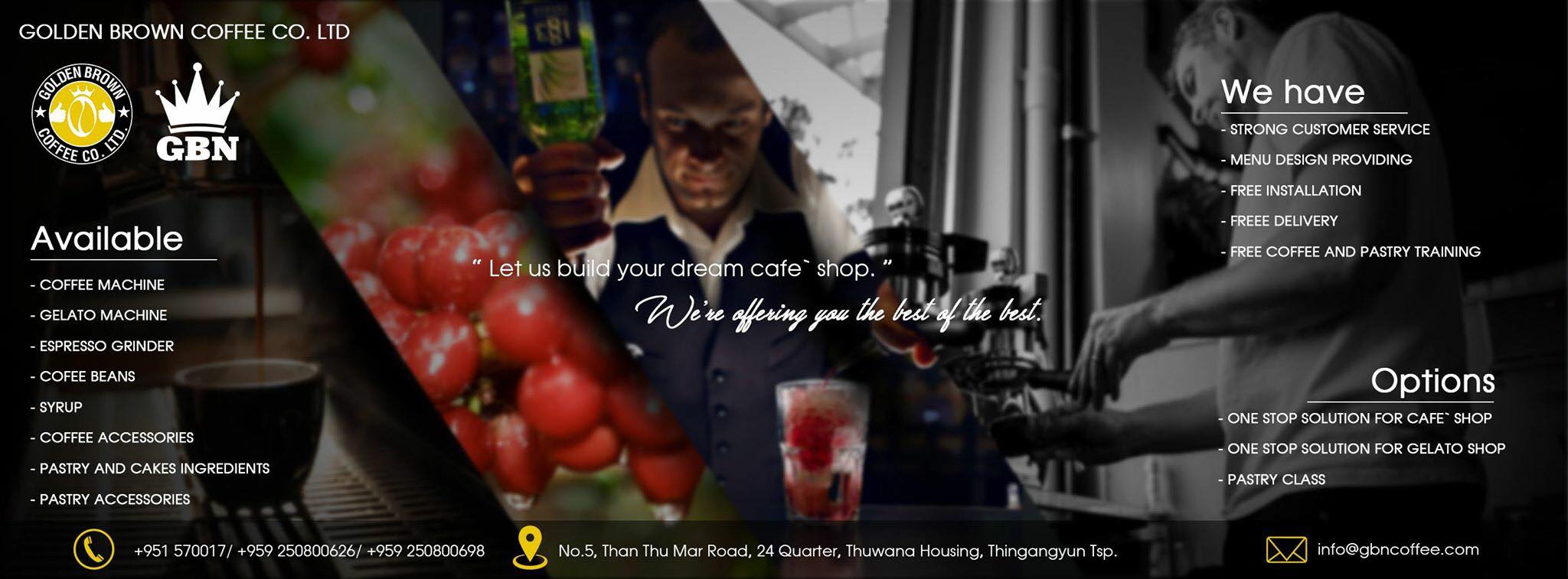 Official Sole distributor in Myanmar for well established coffee brand like Catunambu coffee, Eureka, Gaggia, Gene Cafe, Nemox, Nivona, Saeco and Yama Glass. These brand are selected for its long history of reliability and dedication to their trade. We also distribute our own house blend of roasted coffee sourced from various part of Myanmar. Our roaster makes sure the coffee beans are roasted to perfection.